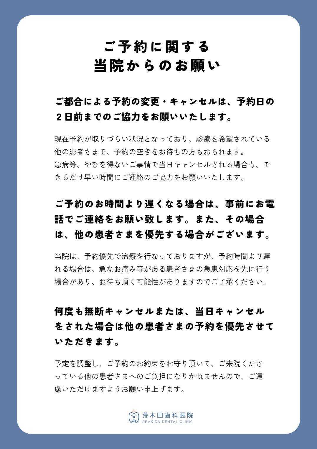 現在、数週間以内の治療や定期検診の予約が取りづらい状況が続いており申し訳ございません。当院では予約制で診療を行なっておりますが、当日キャンセルが増えており、受診をご希望される他の患者さまが予約できないケースが増えております。そのため、以下の3点についてご確認ください。