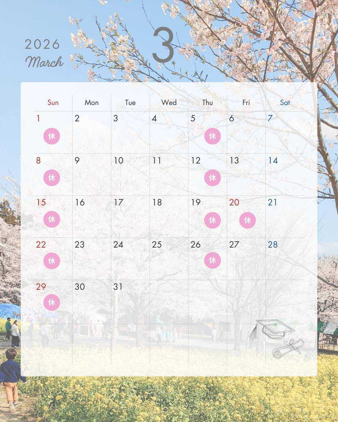 こんにちは、荒木田歯科医院です。3月の診療日カレンダーです。今月は、20日祝日のためお休みを頂いております。